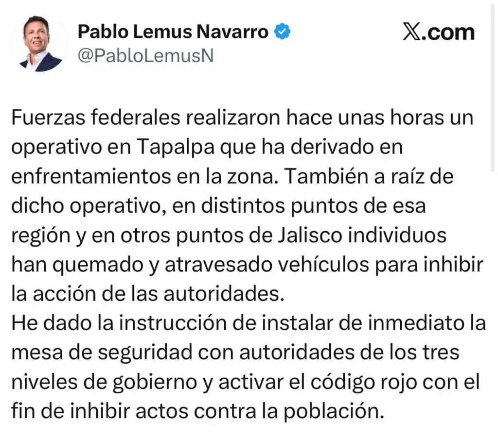 En territorio jalisciense se reportaron vehículos incendiados y cierres viales en municipios como Tlajomulco de Zúñiga, Zacoalco de Torres, Atemajac de Brizuela, Tlaquepaque y en la zona sur del estado. También se informaron afectaciones en carreteras como la Federal 110, a la altura de Las Vallas, en Tamazula de Gordiano, así como en tramos de Tapalpa, San Gabriel y rutas hacia Autlán de Navarro.