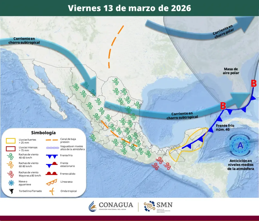 El pronóstico del tiempo para este viernes 13 de marzo advierte lluvias fuertes en el sureste del país debido al desplazamiento del frente frío número 40, el cual se moverá sobre la península de Yucatán y generará precipitaciones acompañadas de descargas eléctricas.