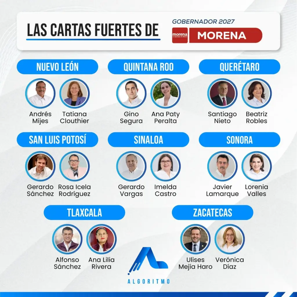 De cara a las elecciones de 2027, según el medio de comunicación Algoritmo, Morena comienza a perfilar a sus posibles candidatos y candidatas a gubernaturas, con liderazgos que ya destacan en distintos estados del país.