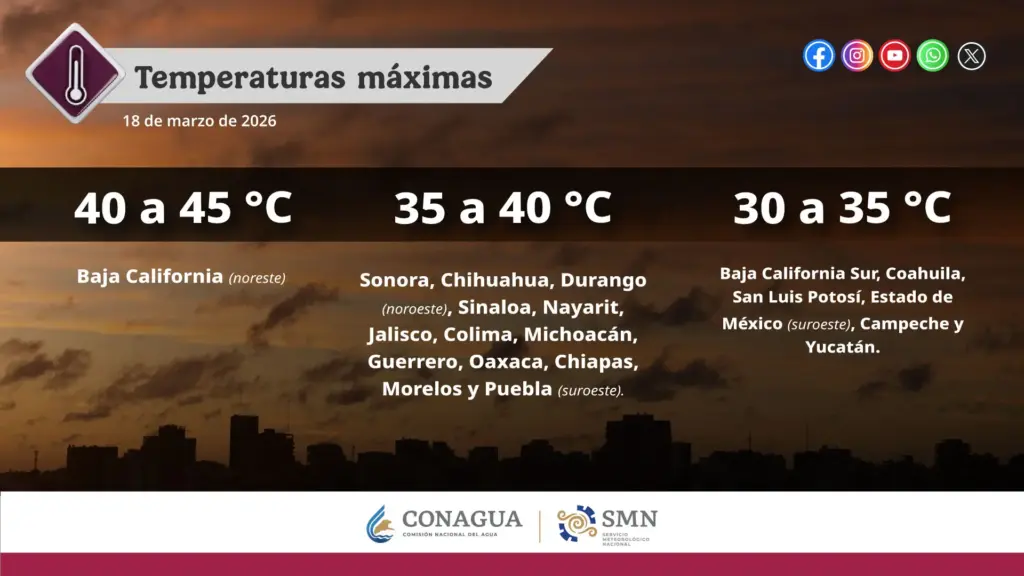El calor extremo continuará este 18 de marzo con temperaturas que podrían alcanzar hasta los 45 grados en varias regiones del país, según la ultima alerta de clima del Servicio Meteorológico Nacional (SMN) y la Comisión Nacional del Agua (CONAGUA).
