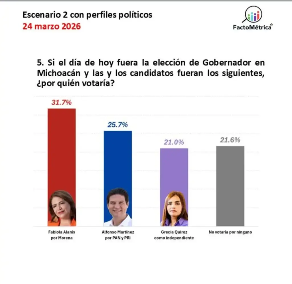 Una encuesta reciente sobre el escenario rumbo a la gubernatura de Michoacán en 2027 coloca a Fabiola Alanís Sámano como la figura con mayor intención de voto.