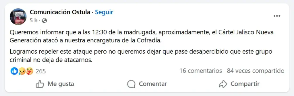 De acuerdo con un mensaje difundido por la propia comunidad a través de sus redes sociales, el ataque ocurrió alrededor de las 00:30 horas y fue atribuido al Cártel Jalisco Nueva Generación (CJNG).