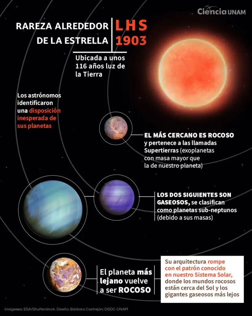 La UNAM participa en el descubrimiento de un sistema planetario a más de 100 años luz, en la estrella LHS 1903, un descubrimiento que llama la atención de la comunidad científica porque rompe con el orden típico de los planetas.